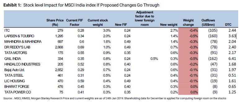 "If implemented, India's already low foreign inclusion factor (FIF) will reduce from 0.38 to 0.37. In addition, the potential weight reduction in stocks will lead to India's aggregate weight falling by about 25 basis points (bps), which implies outflows of $850 million", says Ridham Desai, head of India research and India equity strategist in the co-authored report with Sheela Rathi.
