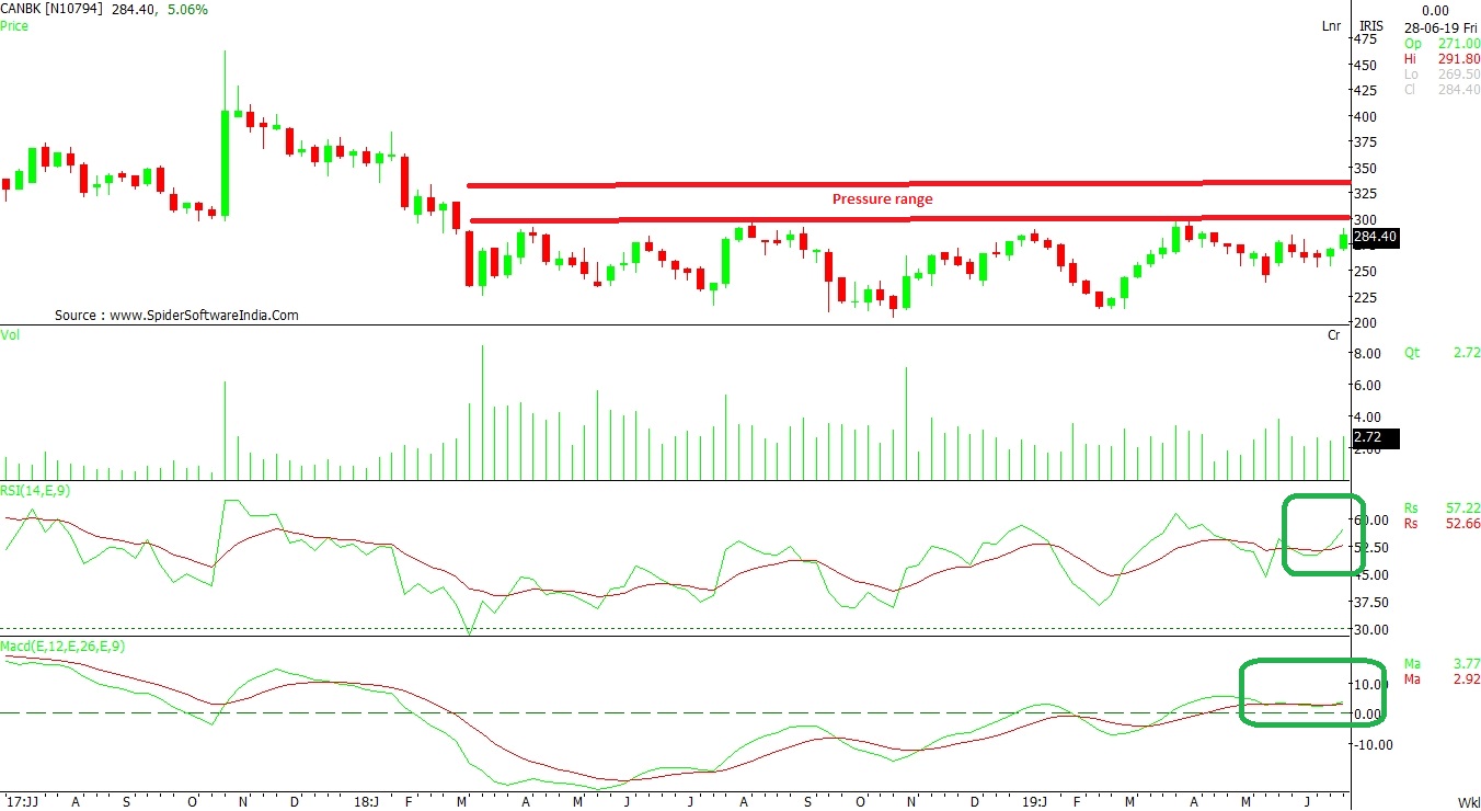 Canara Bank (CANBK): The pressure range of Rs 330 – Rs 300 will determine the next trend for this stock. The current trend shows a positive upside toward this range. Buying can be seen around Rs 270 level. If this level is breached successfully, then a rally towards Rs 400 is possible. As the stock is rising, all the major technical indicators are showing positive strength. The real test would when stock enters the pressure range. CLICK HERE FOR DETAILED CHART VIEW