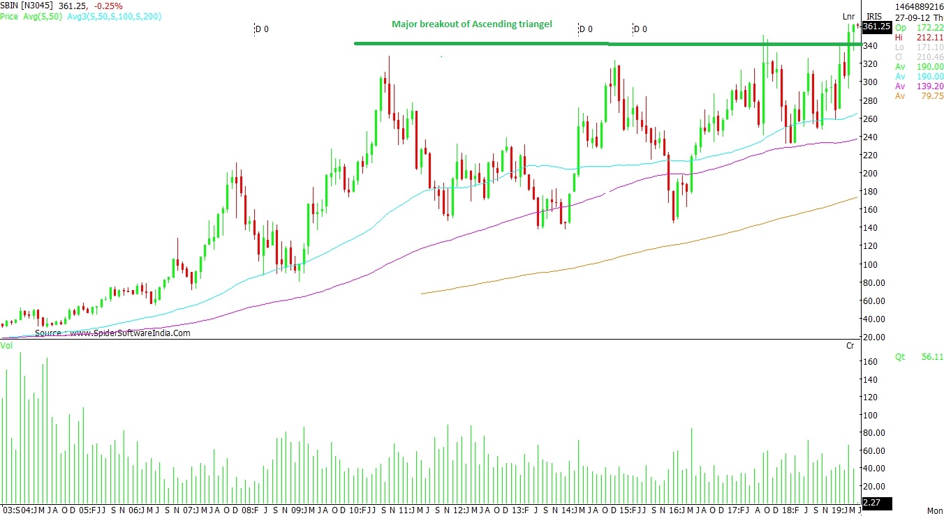 State Bank Of India (SBIN): The monthly chart displays a formation of an 'ascending triangle' with a breakout above the Rs 340 level. This stock is heading towards Rs 400 and Rs 440 in the near-term. As of now, the volumes show a decent rise, a higher level of participation may push this stock even higher. A healthy correction may be looked as buying opportunity, since Rs 311 stays as a strong support level, which is also its 100 days moving average (DMA) CLICK HERE FOR DETAILED CHART VIEW