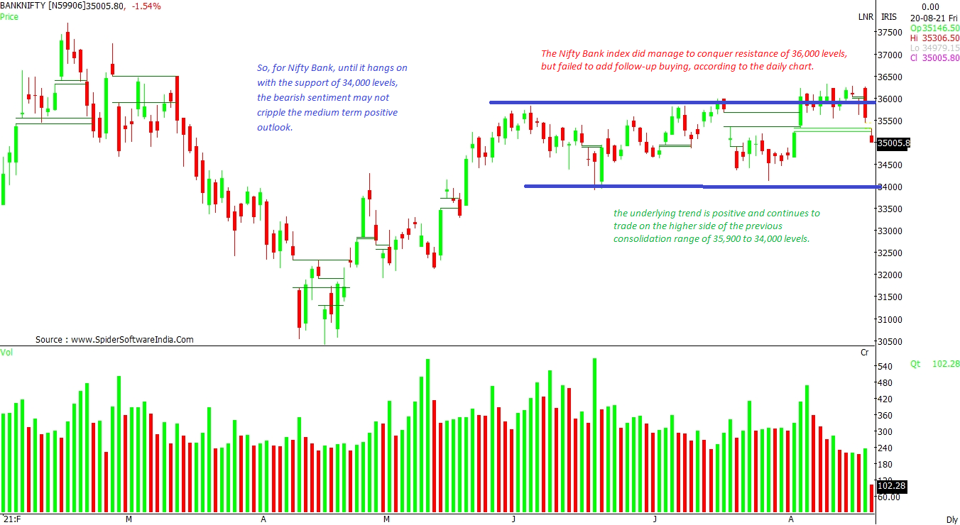 The Nifty Bank index did conquer resistance at 36,000 levels but failed to witness follow-up buying, according to the daily chart. Nonetheless, the underlying trend is positive and continues to trade on the higher side of the previous consolidation range of 35,900 to 34,000 levels. So, for Nifty Bank, until it hangs on with the support of 34,000 levels, the bearish sentiment may not cripple the medium-term positive outlook. CLICK HERE FOR THE CHART