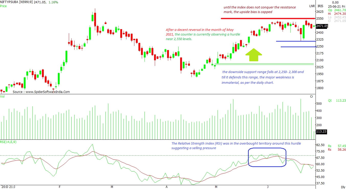 After a decent reversal in the month of May 2021, the index is currently witnessing a hurdle near 2,550 levels. The Relative Strength Index (RSI) is in the overbought territory around this hurdle, suggesting selling pressure. Going forward, till the index doesn't conquer this resistance mark, the upside bias will remain capped. However, the downside support range falls at 2,250- 2,300 and till it defends this range, any major weakness is immaterial, as per the daily chart. CLICK HERE FOR THE CHART