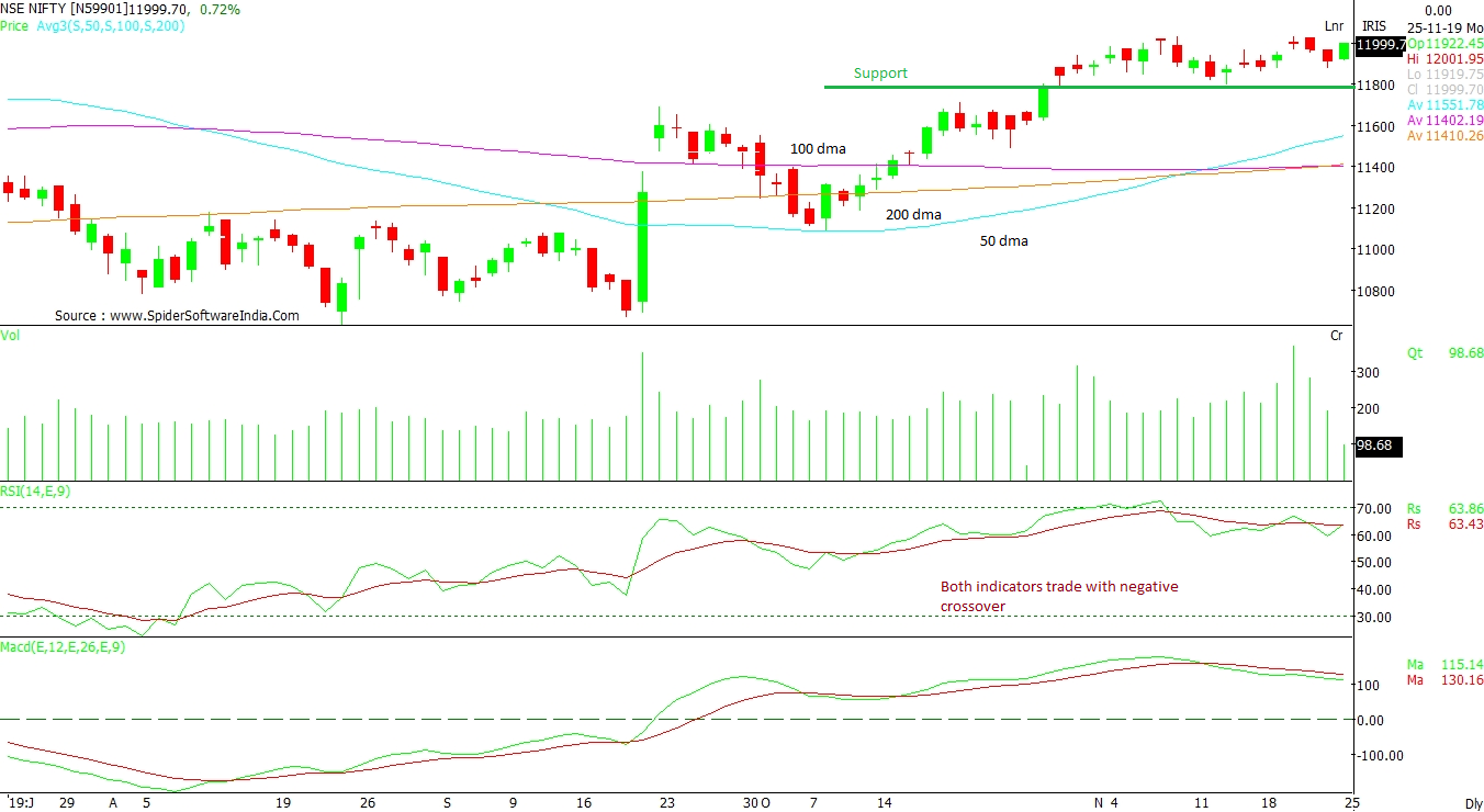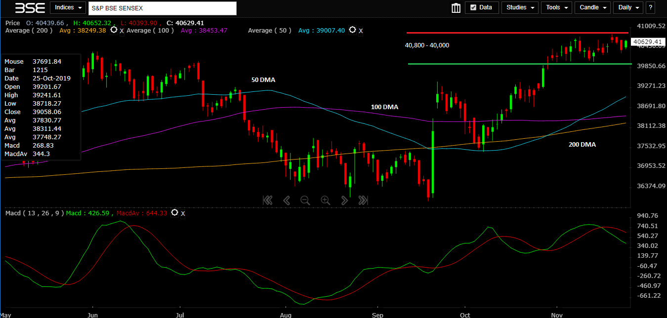 S&P BSE SENSEX: The index may consolidate in the range of 40,000 and 40,800 and then gain further gorund. The daily chart shows buying around 40,200. If this level holds, then a further upside looks certain. Although, MACD trades with a negative crossover, the charts do not indicate any major weakness as of now. CLICK HERE FOR THE CHART