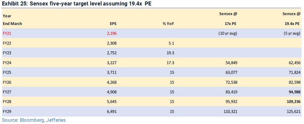 “The consensus earnings growth forecast for the MSCI India this year is 20.3 per cent, compared with 11.3 per cent for the Asia ex-Japan region. While Jefferies’ India office is forecasting 19.2 per cent earnings growth for the Nifty in FY23 beginning April 1, following an estimated 38 per cent growth in FY22. This follows positive earnings revisions last year. Consensus earnings forecasts were revised up by 14.4 per cent in 2021. The target of a Sensex at 100,000 is now eminently achievable on a five-year view assuming a trend 15 per cent EPS growth and that a five-year average multiple of 19.4 is maintained. The Sensex will hit 100,000 during fiscal 2026-27 (FY27) or sometime in late 2026, based on such assumptions,” Wood wrote in his weekly note to investors, GREED & fear.