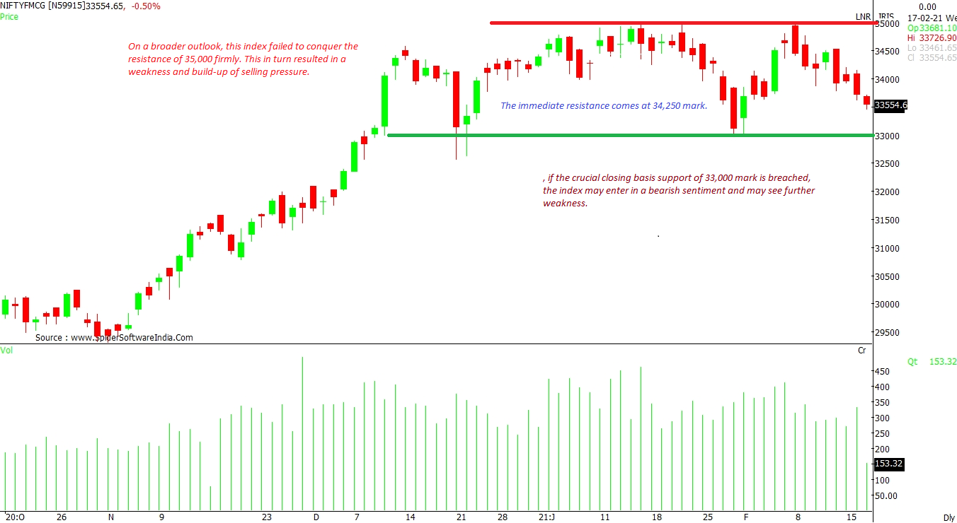 NIFTY FMCG: The index has failed to conquer the resistance of 35,000 firmly. This, in turn, has resulted in weakness and a build-up of selling pressure. Now, if the crucial closing basis support of 33,000 mark is breached, the index may enter a bearish sentiment and may further weaken. The immediate resistance comes at 34,250 leveks. CLICK HERE FOR THE CHART