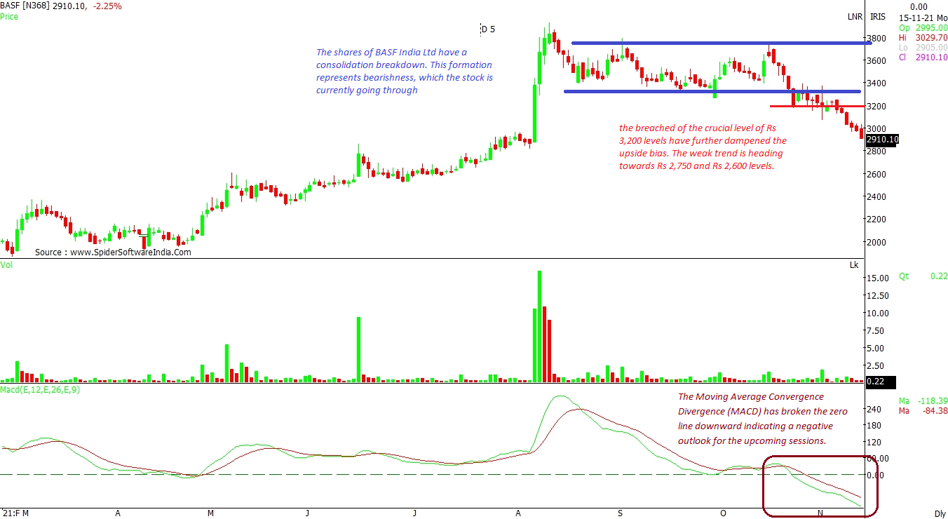 The shares of BASF India Ltd have witnessed a consolidation breakdown, as per the weekly chart. This formation represents bearishness, which the stock is currently going through. Subsequently, the breach of the crucial level of Rs 3,200 has further dampened the upside bias. The weak trend suggests that the stock seems to be heading towards Rs 2,750 and Rs 2,600 levels. The Moving Average Convergence Divergence (MACD) has broken the zero line downward indicating a negative outlook for the upcoming sessions. CLICK HERE FOR THE CHART