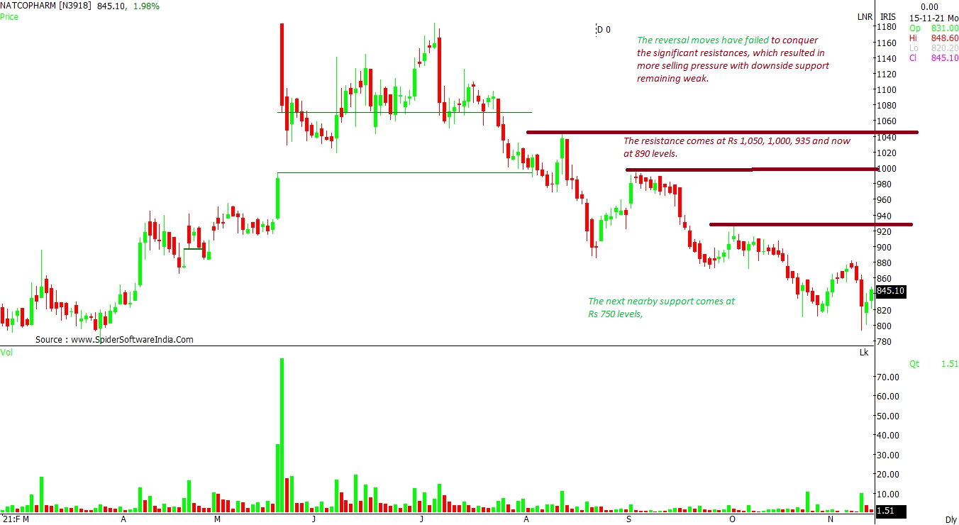 The reversal moves have failed to conquer the significant resistances, which resulted in more selling pressure with downside support remaining weak. The resistance comes at Rs 1,050, Rs 1,000, Rs 935 and now at Rs 890 level. The next nearby support comes at Rs 750 level, according to the daily charts. CLICK HERE FOR THE CHART