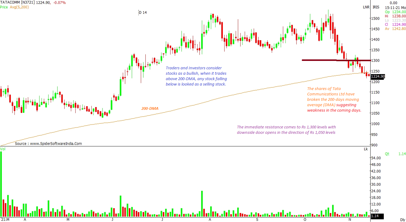 The shares of Tata Communications Ltd have broken the 200-day moving average (DMA) suggesting weakness in the coming days. Traders and Investors consider stocks as a bullish, when it trades above 200-DMA, any stock falling below is looked as a selling stock. The immediate resistance comes to Rs 1,300 and downside door opens in the direction of Rs 1,050 level, according to the daily chart. . CLICK HERE FOR THE CHART