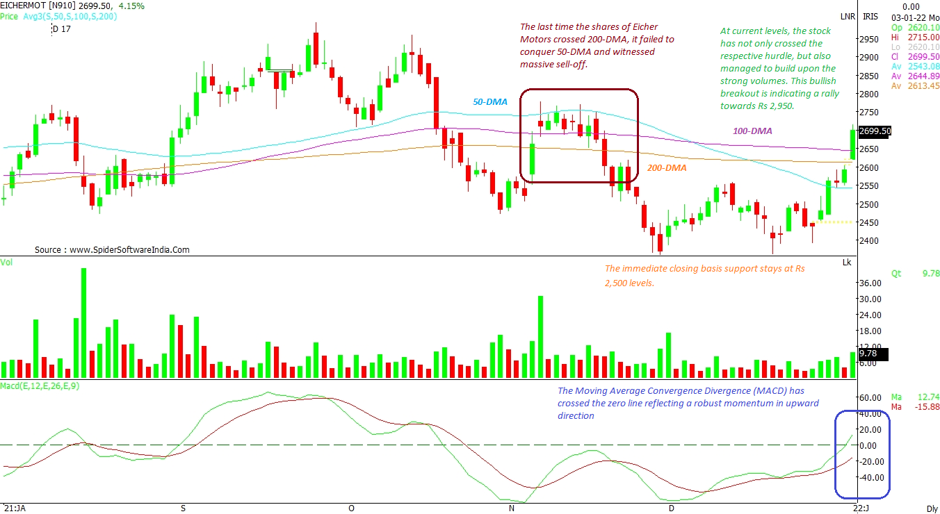 The last time the shares of Eicher Motors crossed 200-DMA, it failed to conquer 50-DMA and witnessed massive sell-off. At current levels, the stock has not only crossed the respective hurdle, but also managed to build upon the strong volumes. This bullish breakout is indicating a rally towards Rs 2,950. The Moving Average Convergence Divergence (MACD) has crossed the zero line reflecting a robust momentum in upward direction, as per the daily chart. The immediate closing basis support stays at Rs 2,500 levels. CLICK HERE FOR THE CHART