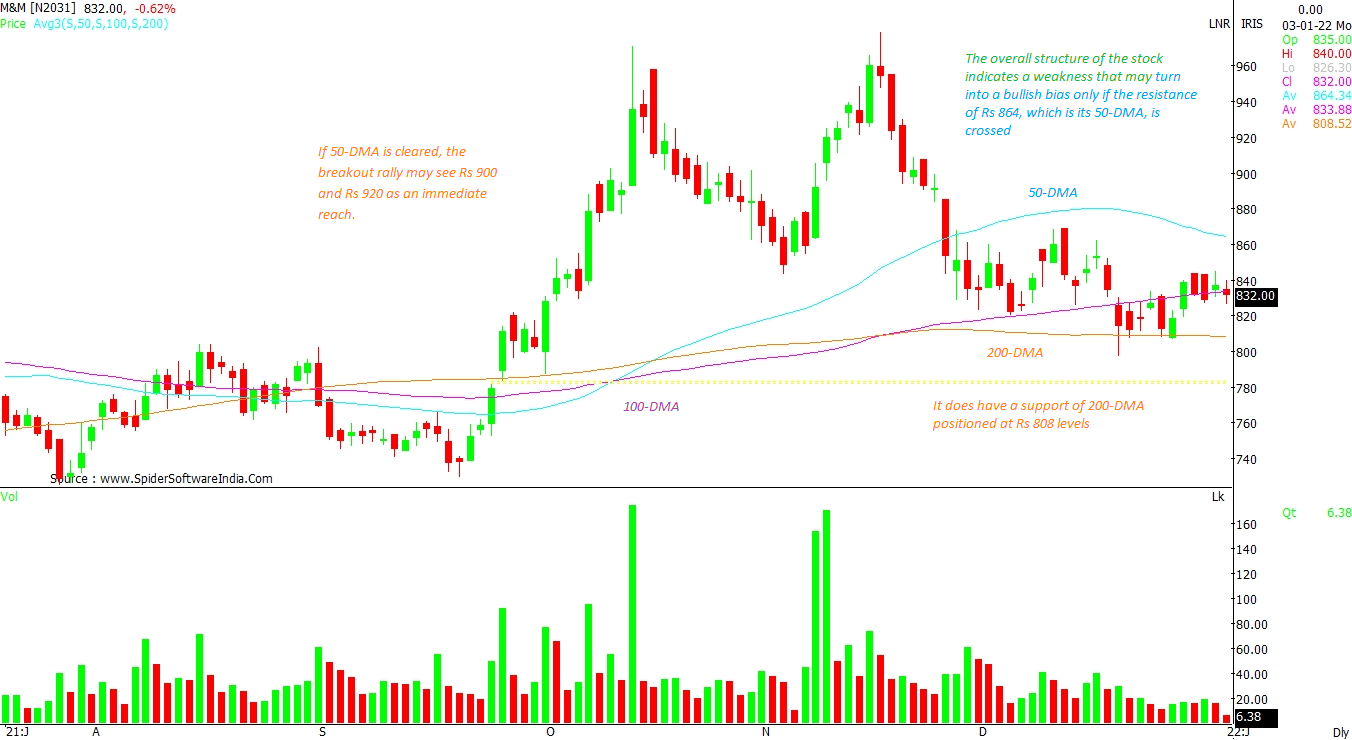 The overall structure of the stock indicates a weakness that may turn into a bullish bias only if the resistance of Rs 864, which is its 50-DMA, is crossed. It does have a support of 200-DMA positioned at Rs 808 levels, according to the daily chart. If 50-DMA is cleared, the breakout rally may see Rs 900 and Rs 920 as an immediate reach. CLICK HERE FOR THE CHART