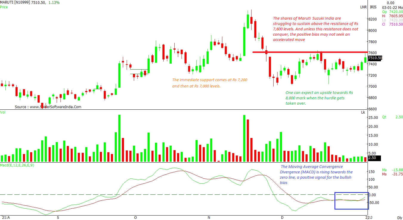 The shares of Maruti Suzuki India are struggling to sustain above the resistance of Rs 7,600 levels. And unless this resistance does not gets conquered, the positive bias may not seek an accelerated move. One can expect an upside towards Rs 8,000 mark when the hurdle gets taken over. The MACD is rising towards the zero line, a positive signal for the bullish bias, according to the daily chart. The immediate support comes at Rs 7,200 and then at Rs 7,000 levels. CLICK HERE FOR THE CHART