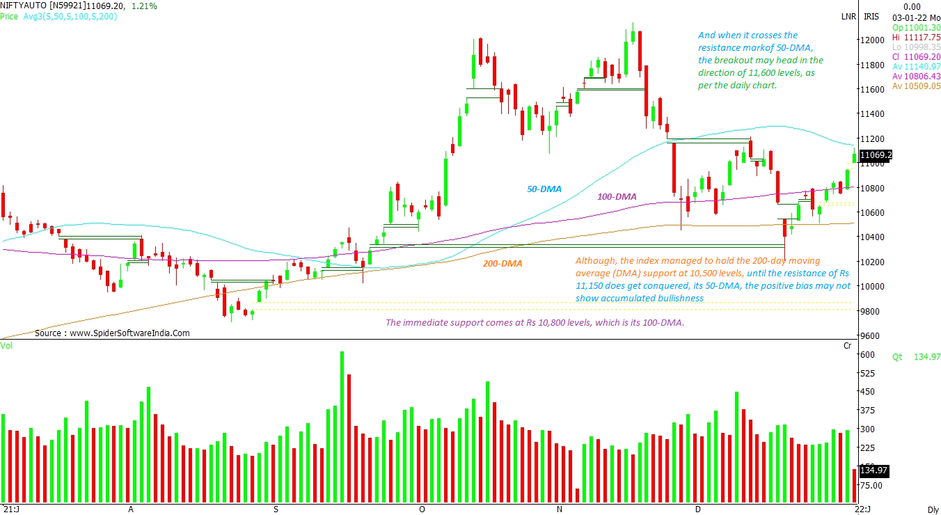 Although, the index managed to hold the 200-day moving average (DMA) support at 10,500 levels, until the resistance of Rs 11,150 does get conquered, its 50-DMA, the positive bias may not show accumulated bullishness. And when it crosses the resistance mark, the breakout may head in the direction of 11,600 levels, as per the daily chart. The immediate support comes at Rs 10,800 levels, which is its 100-DMA. CLICK HERE FOR THE CHART