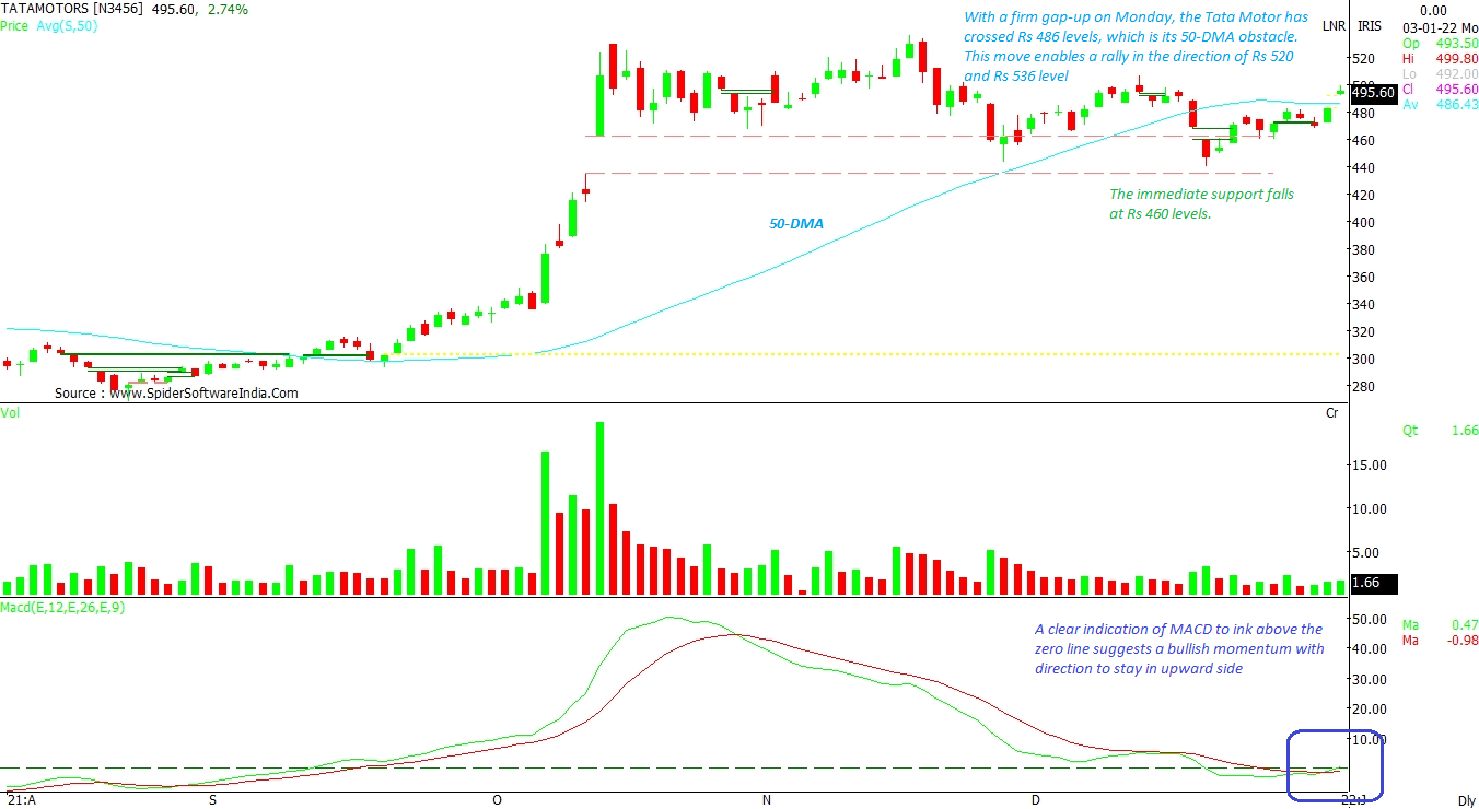 With a firm gap-up on Monday, the Tata Motor has crossed Rs 486 levels, which is its 50-DMA obstacle. This move enables a rally in the direction of Rs 520 and Rs 536 level, according to the daily chart. A clear indication of MACD to ink above the zero line suggests a bullish momentum with direction to stay in upward side. The immediate support falls at Rs 460 levels. CLICK HERE FOR THE CHART