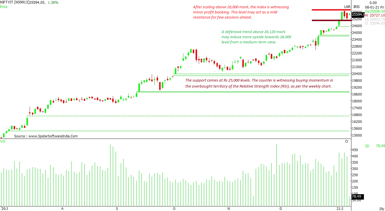 NIFTY IT INDEX: After scaling the 26,000 mark, the index is witnessing minor profit-booking. This level may act as a mild resistance for a few sessions ahead. A defensive trend above 26,120 mark may induce more upside towards 28,000 level from a medium-term view. The support comes at Rs 25,000 levels. The counter is witnessing buying momentum in the overbought territory of the Relative Strength Index (RSI), as per the weekly chart. CLICK HERE FOR THE CHART