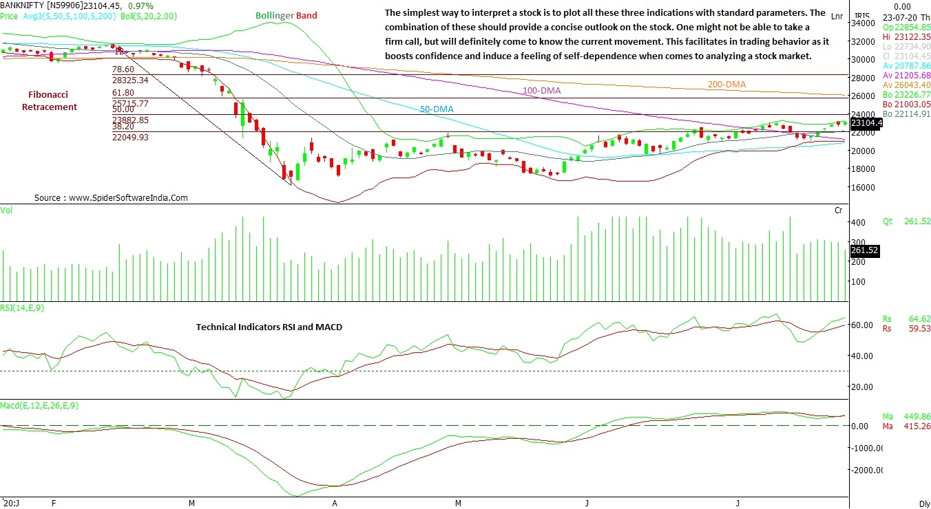 Moving average includes 50-day moving average (DMA), 100-DMA, and 200-DMA. Standard parameters help to understand the price trend. Price above these averages show bullish sentiment. Bollinger band defines price in standard deviation with 20-DMA differentiating the price. And, Fibonacci retracement is based on the Golden Ratio that recognizes support and resistance levels.