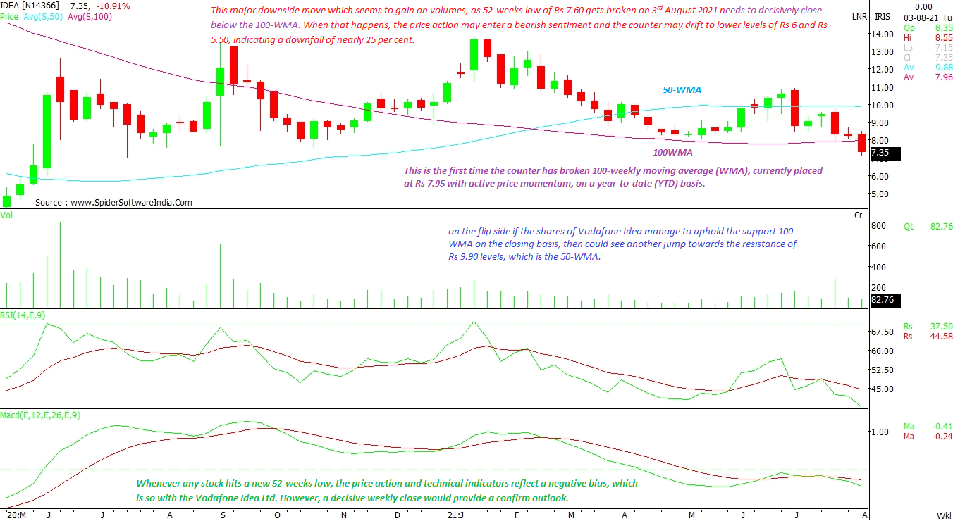 On the flip side, if shares of Vodafone Idea manage to uphold the support 100-WMA on the closing basis, then the stock could see a jump towards the resistance of Rs 9.90 levels, which is the 50-WMA.
