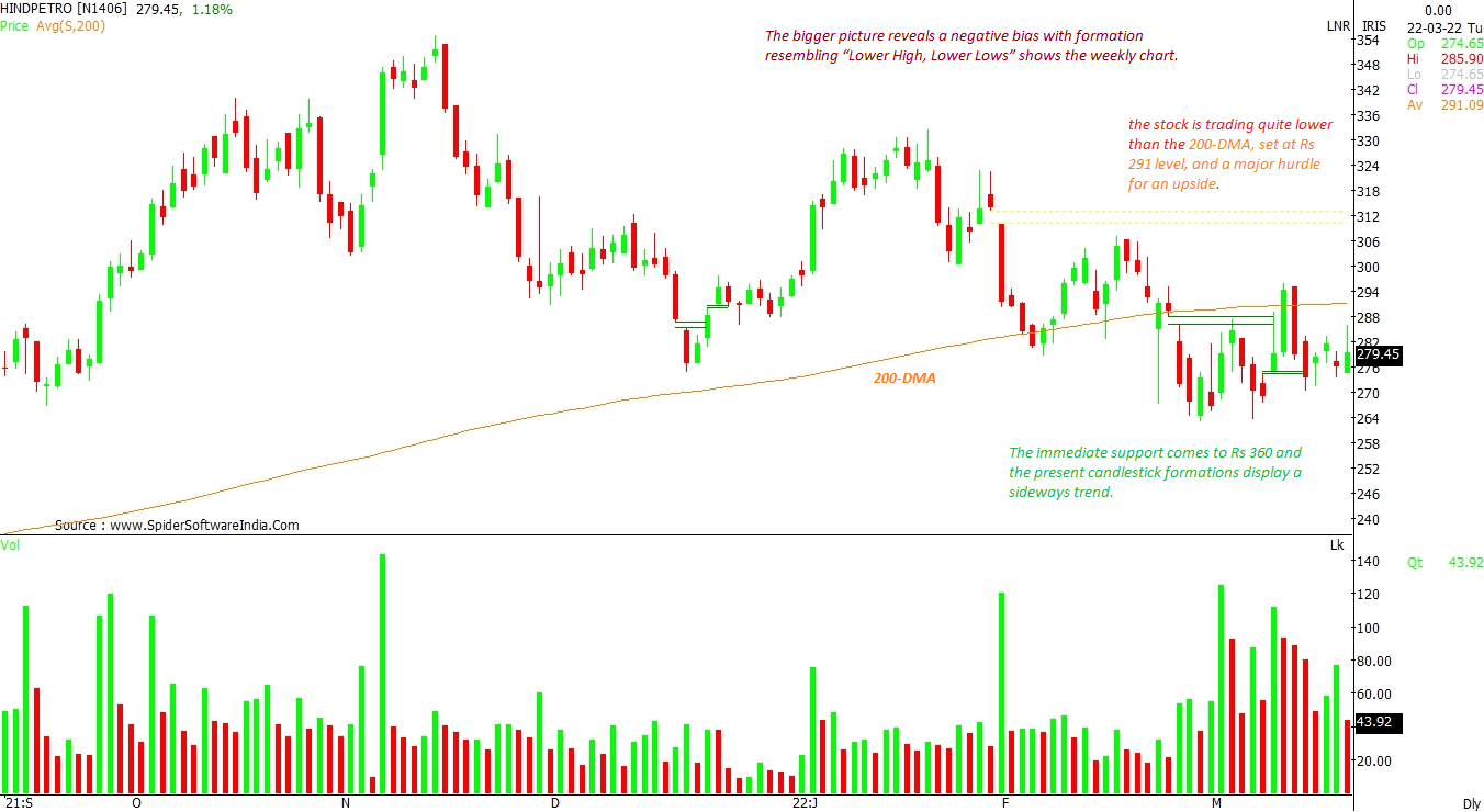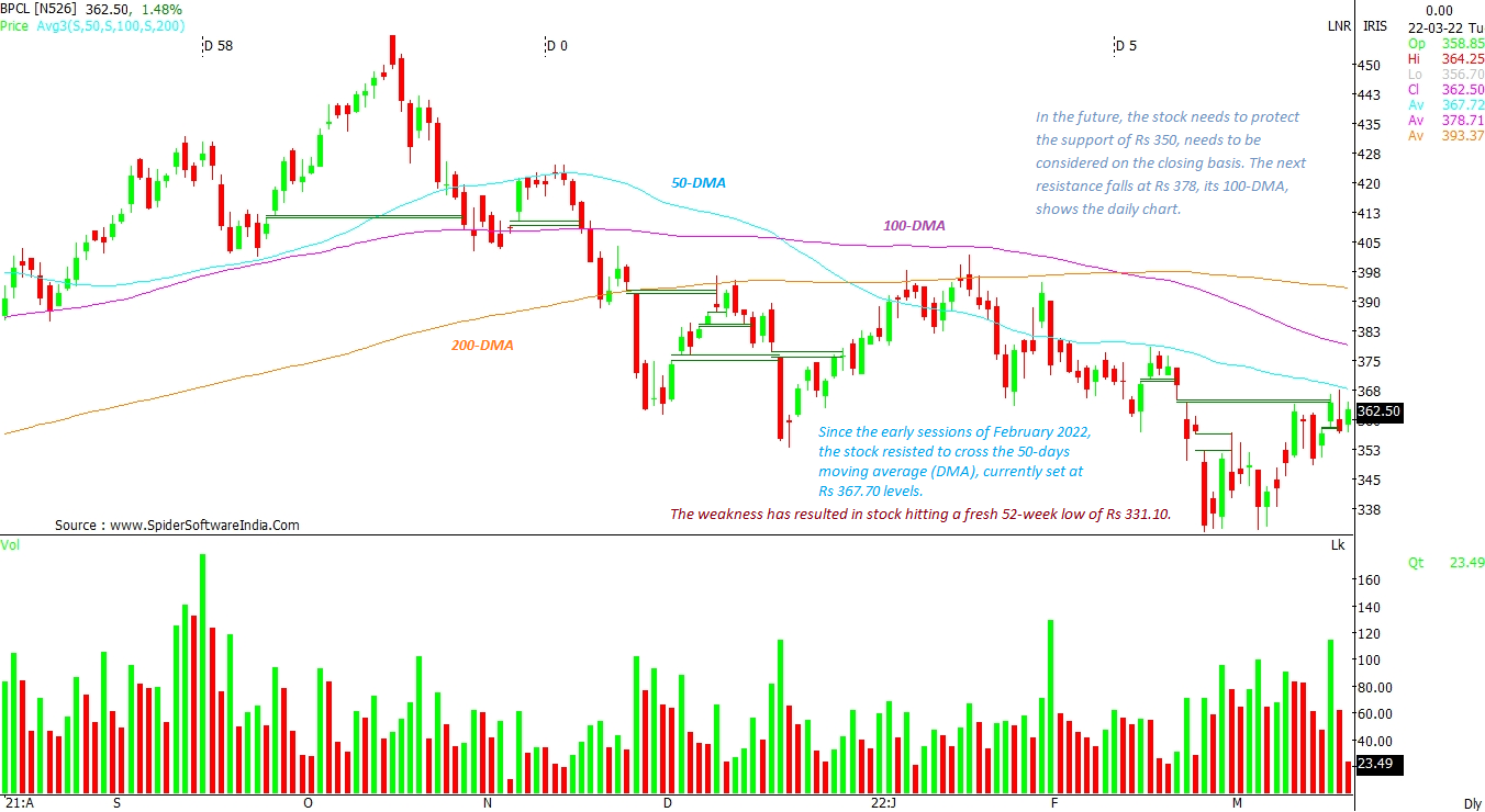 Since early February 2022, the stock has been unable to cross the 50-days moving average (DMA), currently set at Rs 367.70 levels. The weakness has resulted in the counter hitting a fresh 52-week low of Rs 331.10. Going ahead, BPCL needs to protect the support of Rs 350 on a closing basis. The next resistance falls at Rs 378, its 100-DMA, shows the daily chart. CLICK HERE FOR THE CHART