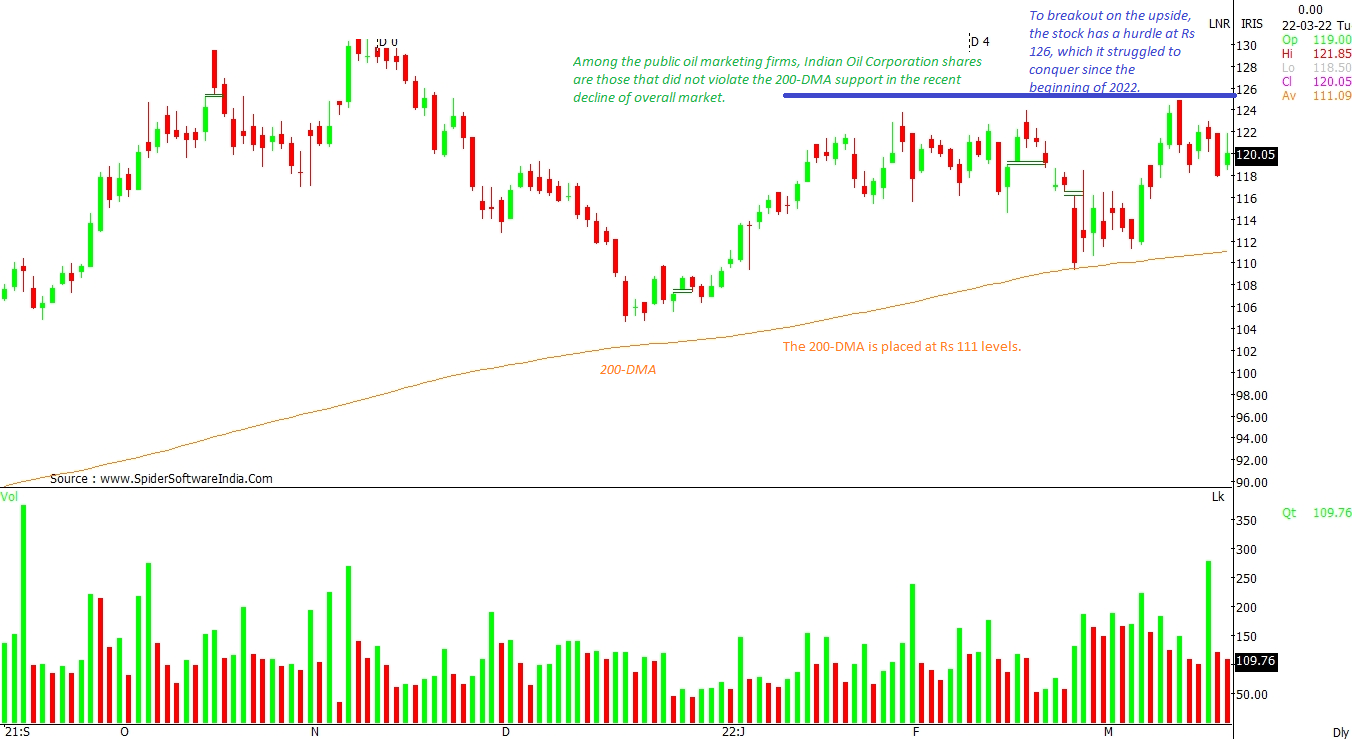 Among the public oil marketing firms, Indian Oil Corporation (IOC) shares did not violate their 200-DMA support amid the recent market correction. The 200-DMA is placed at Rs 111 levels. To break out on the upside, the stock needs to cross the hurdle of Rs 126, which it has struggled to conquer since the beginning of 2022. CLICK HERE FOR THE CHART