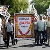 Protesters raised slogans against the Central government and carried placards reading, "RIP Acche Din" and "Acche Dino ki Punya Tithi".