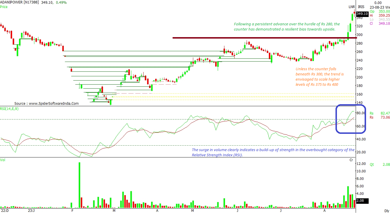 Following a persistent advance over the hurdle of Rs 280, the counter has demonstrated a resilient bias towards upside. The surge in volume clearly indicates a build-up of strength in the overbought category of the Relative Strength Index (RSI). Unless the counter falls beneath Rs 300, the trend is envisaged to scale higher levels of Rs 375 to Rs 400. CLICK HERE FOR THE CHART