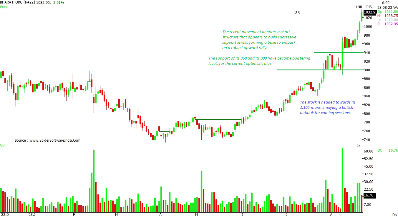 The recent movement denotes a chart structure that appears to build successive support levels, forming a base to embark on a robust upward rally. The support of Rs 950 and Rs 900 have become bolstering levels for the current optimistic bias. The stock is headed towards Rs 1,160-mark, implying a bullish outlook for coming sessions. CLICK HERE FOR THE CHART.