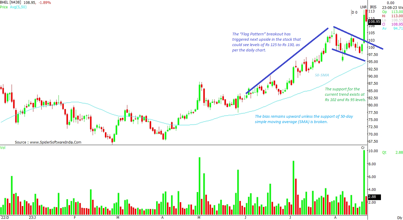 The “Flag Pattern” breakout has triggered next upside in the stock that could see levels of Rs 125 to Rs 130, as per the daily chart. The support for the current trend exists at Rs 102 and Rs 95 levels. The bias remains upward unless the support of 50-day simple moving average (SMA) is broken. CLICK HERE FOR THE CHART