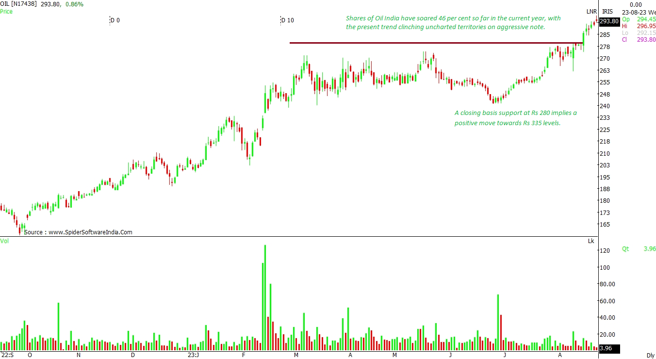 Shares of Oil India have soared 46 per cent so far in the current year, with the present trend clinching uncharted territories on aggressive note. A closing basis support at Rs 280 implies a positive move towards Rs 335 levels. CLICK HERE FOR THE CHART