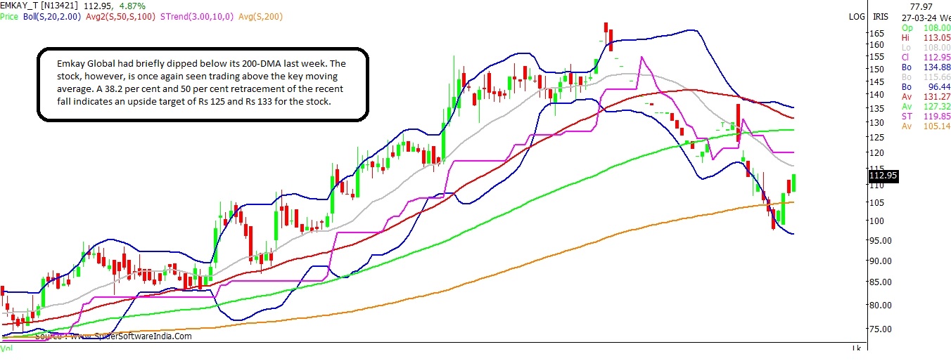 Emkay Global has plunged 42 per cent in the last two months. However, the stock now seems to be seeking support around its 200-DMA, which it briefly broke last week, around Rs 105. CLICK HERE FOR THE CHART
