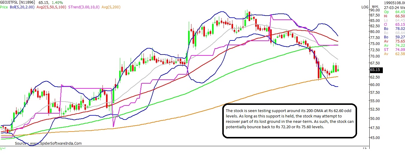 Geojit Financial Services has declined close to 32 per cent in the last two months. However, the stock seems to have found consistent support around its 200-DMA since the last three weeks. The 200-DMA presently stands at Rs 62.60. CLICK HERE FOR THE CHART