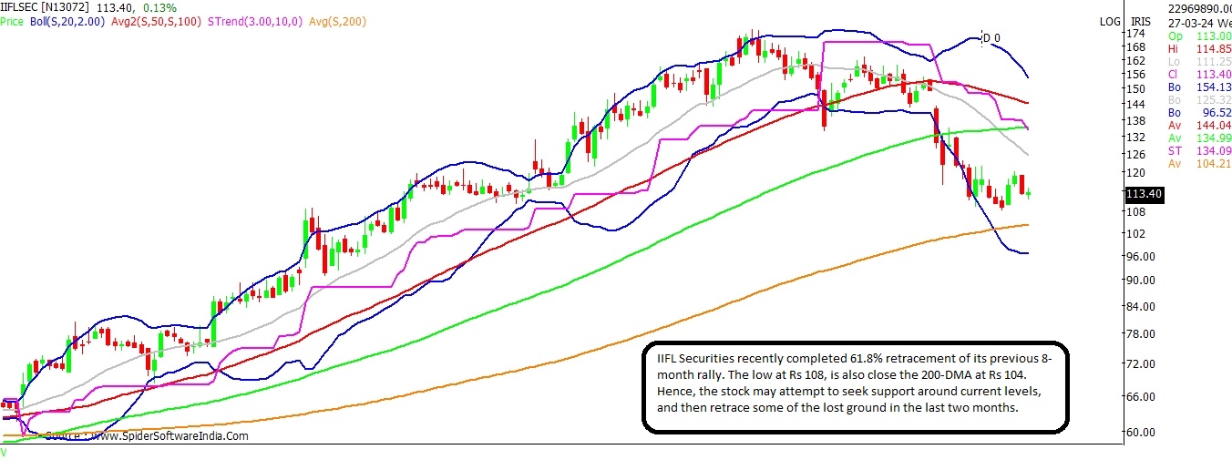 The recent low at Rs 108, suggests that the stock may have completed 61.8 per cent retracement of the previous rally. Further the Rs 108-level, is also close to the 200-DMA, which stands at Rs 104. Hence, the stock is expected to seek support around these levels. CLICK HERE FOR THE CHART