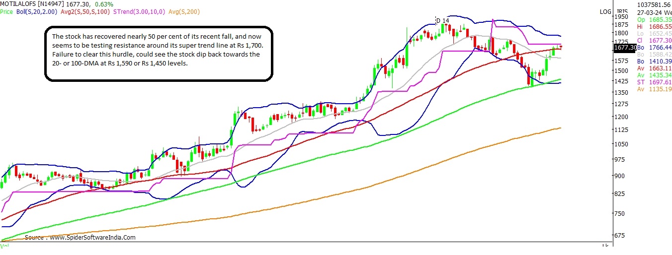 Motilal Oswal had plunged nearly 29 per cent from its high of Rs 1,938 in early February 2024 to a low of Rs 1,381 on March 14. The stock, thereafter, has recovered close to 50 per cent of its recent fall and quotes around Rs 1,670 levels.
