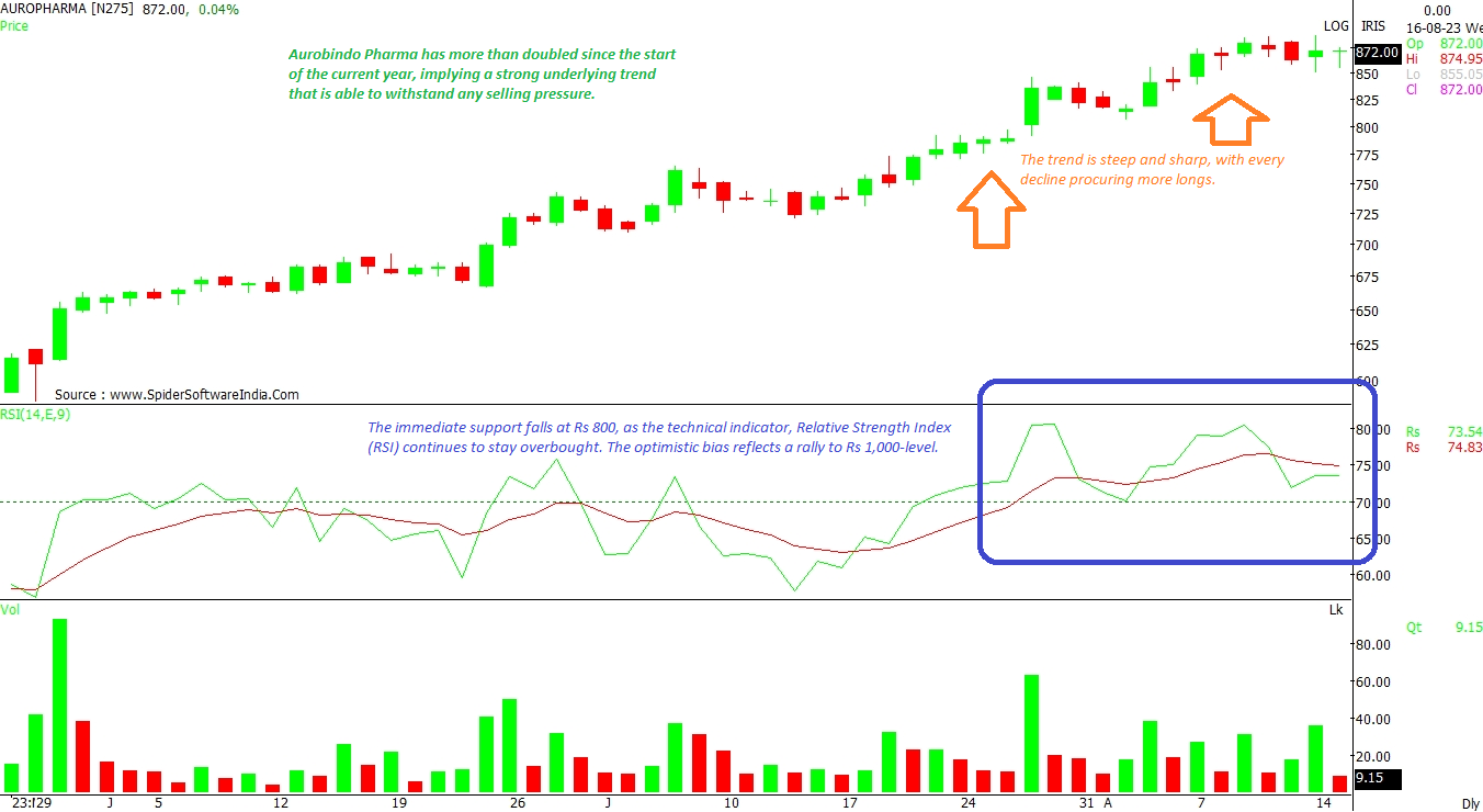 Aurobindo Pharma has more than doubled since the start of the current year, implying a strong underlying trend that is able to withstand any selling pressure. The trend is steep and sharp, with every decline procuring more longs. The immediate support falls at Rs 800, as the technical indicator, Relative Strength Index (RSI) continues to stay overbought. The optimistic bias reflects a rally to Rs 1,000-level. CLICK HERE FOR THE CHART