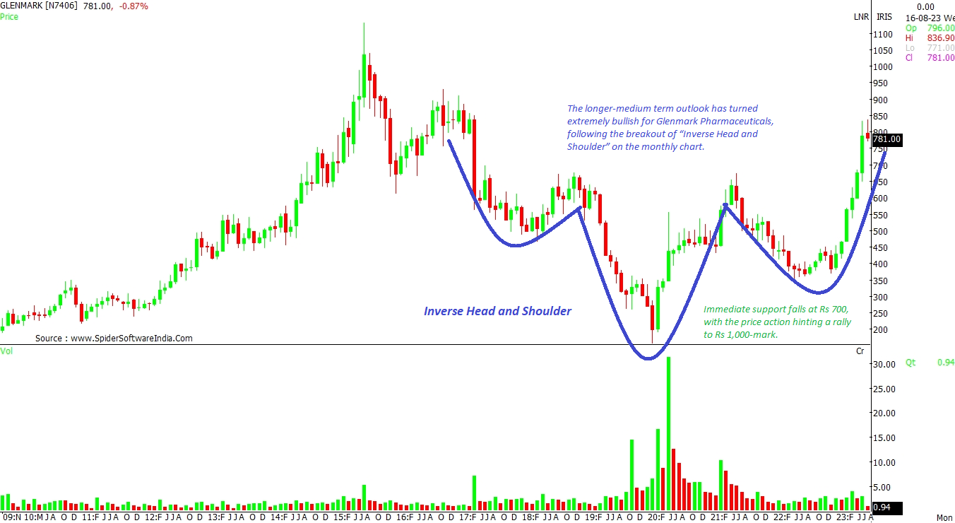 The longer-medium term outlook has turned extremely bullish for Glenmark Pharmaceuticals, following the breakout of “Inverse Head and Shoulder” on the monthly chart. Immediate support falls at Rs 700, with the price action hinting a rally to Rs 1,000-mark. CLICK HERE FOR THE CHART
