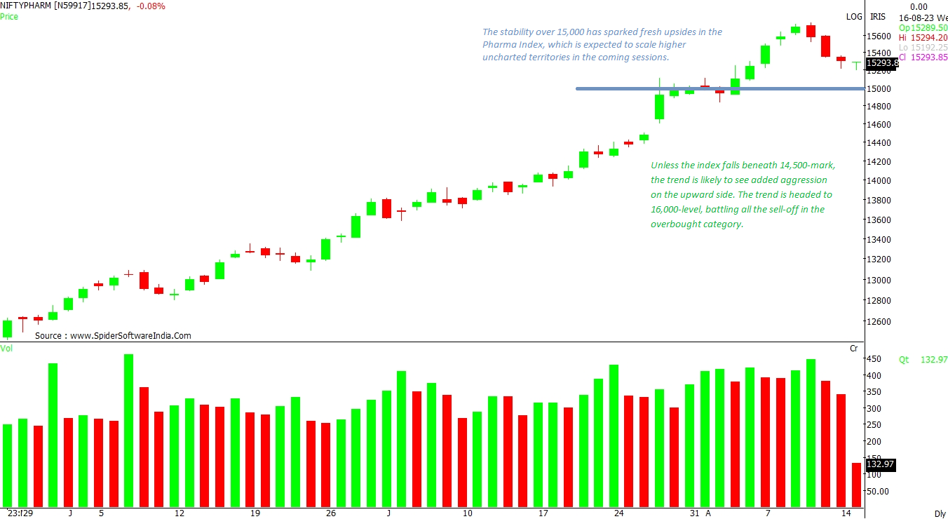 The stability over 15,000 has sparked fresh upsides in the Pharma Index, which is expected to scale higher uncharted territories in the coming sessions. Unless the index falls beneath 14,500-mark, the trend is likely to see added aggression on the upward side. The trend is headed to 16,000-level, battling all the sell-off in the overbought category. CLICK HERE FOR THE CHART