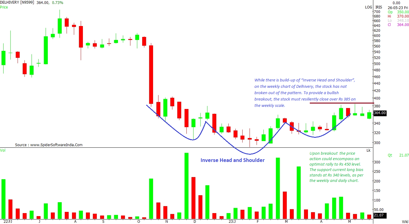 While there is build-up of “Inverse Head and Shoulder”, on the weekly chart of Delhivery, the stock has not broken out of the pattern. To provide a bullish breakout, the stock must resiliently close over Rs 385 on the weekly scale.