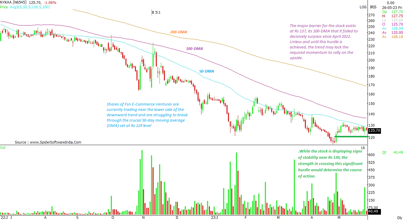 Shares of Fsn E-Commerce Ventures are currently trading near the lower side of the downward trend and are struggling to break through the crucial 50-day moving average (DMA) set at Rs 129 level. While the stock is displaying signs of stability near Rs 120, the strength in crossing this significant hurdle would determine the course of action.