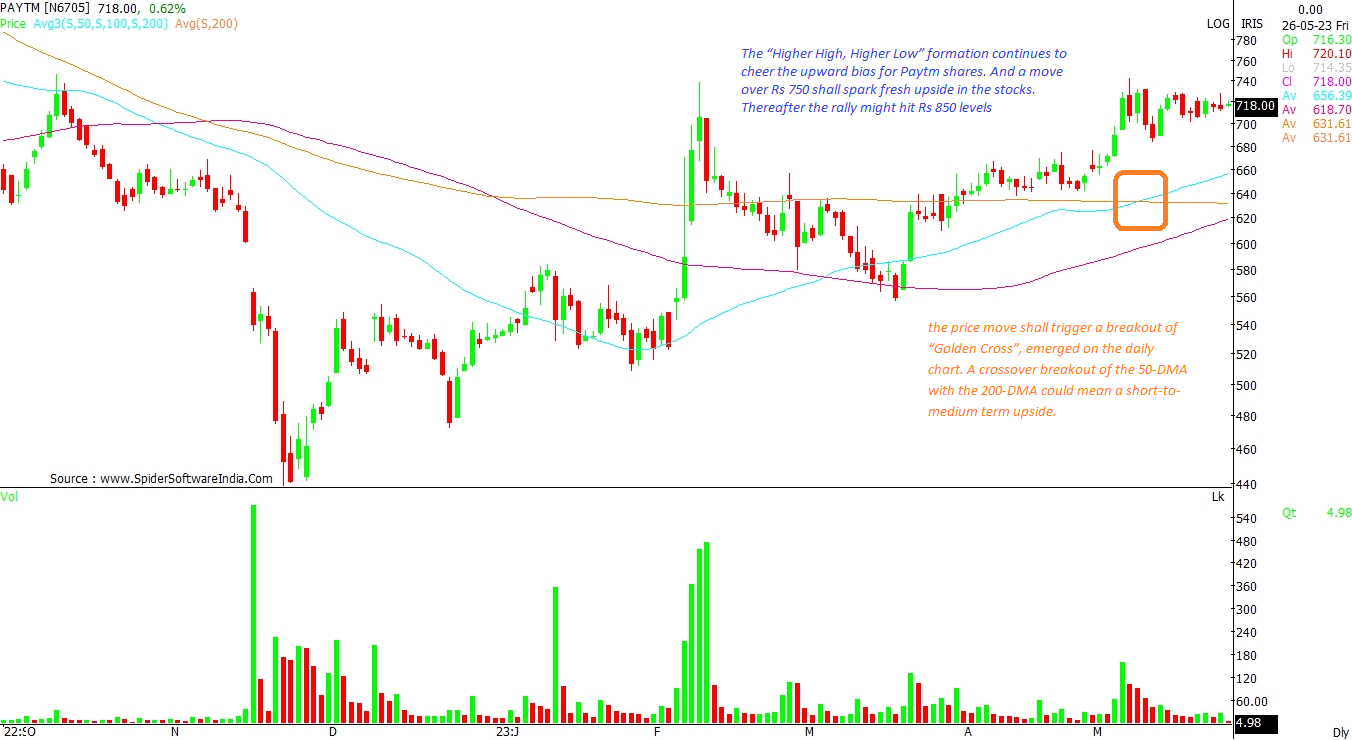 The “Higher High, Higher Low” formation continues to cheer the upward bias for Paytm shares. And a move over Rs 750 shall spark fresh upside in the stocks. Thereafter the rally might hit Rs 850 levels, as per the daily chart.