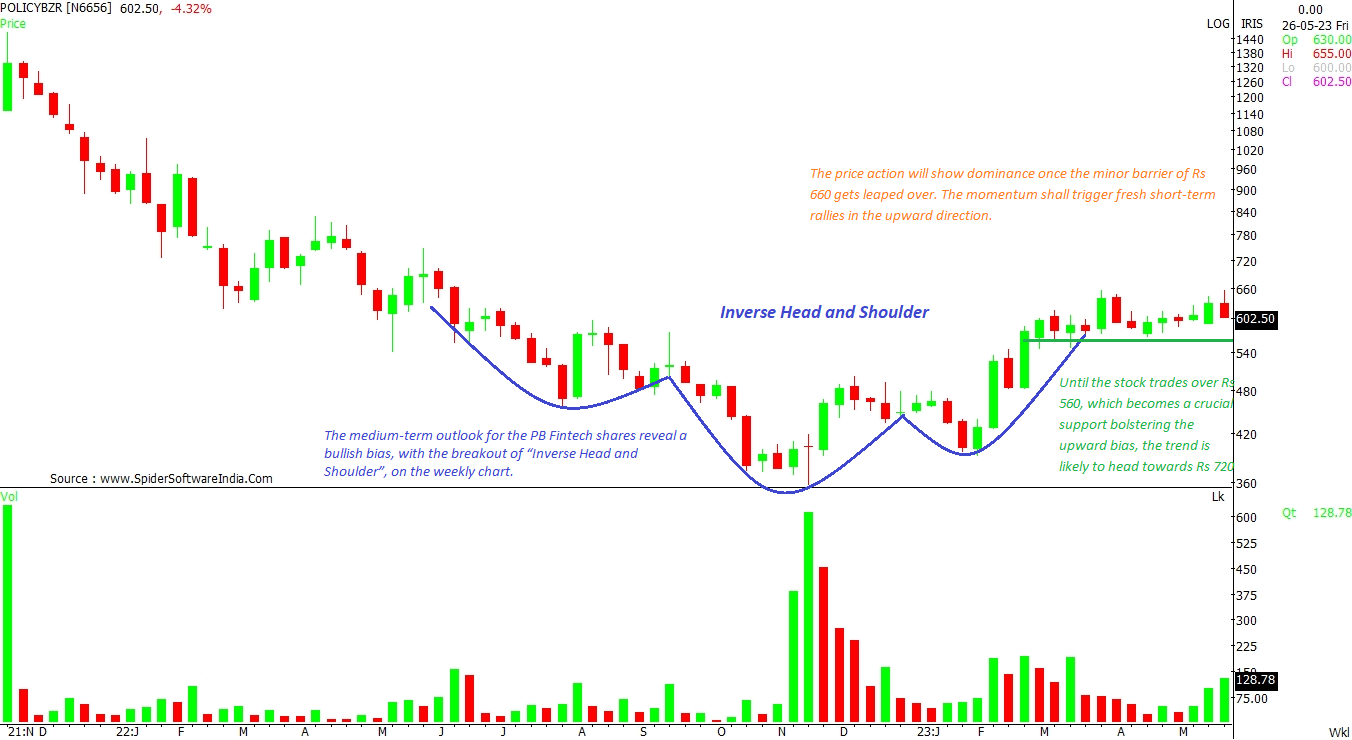 The medium-term outlook for the PB Fintech shares reveal a bullish bias, with the breakout of “Inverse Head and Shoulder”, on the weekly chart. Until the stock trades over Rs 560, which becomes a crucial support bolstering the upward bias, the trend is likely to head towards Rs 720 levels.