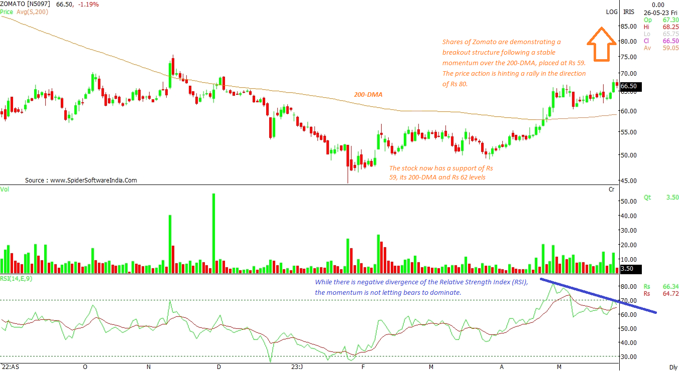 Shares of Zomato are demonstrating a breakout structure following a stable momentum over the 200-DMA, placed at Rs 59. The price action is hinting a rally in the direction of Rs 80.