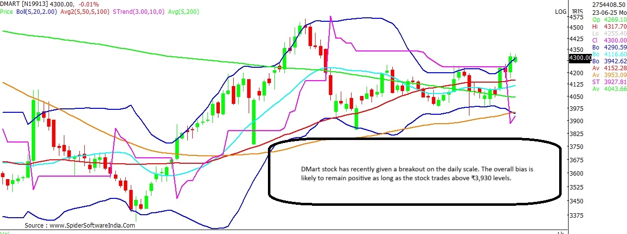 Current Price: ₹4,300 Upside Potential: 31% Support: ₹4,153; ₹4,117; ₹4,044; ₹3,930 Resistance: ₹4,540; ₹4,725; ₹5,100 Technical charts indicate that going ahead, DMart is likely to trade with a favourable bias as long as the stock holds above ₹3,930 levels. Intermediate support for the stock can be anticipated around its 50-Day Moving Average (50-DMA), which stands at ₹4,153 and the 20-DMA at ₹4,117. That apart, the 200-DMA at ₹4,044 is likely to act as a significant support. CLICK HERE FOR THE CHART ALSO READ | PolicyBazaar, DLF, Airtel: Trading strategies for Chris Wood-owned stocks On the upside, the long-term chart shows that DMart share price can potentially soar to ₹5,630 levels - this implies a potential upside target of 31 per cent from present levels. As per the technical charts, DMart could face interim resistance around ₹4,540, ₹4,725 and ₹5,100 levels on its way up. ALSO READ | PolicyBazaar, DLF, Airtel: Trading strategies for Chris Wood-owned stocksOne subscription. Two world-class reads.