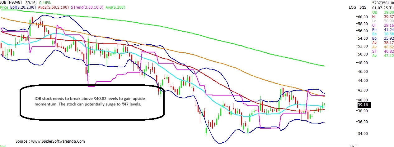 Current Price: ₹221 Upside Potential: 19.9% Support: ₹216; ₹206 Resistance: ₹240; ₹250 KNR Constructions stock is likely to trade with a positive bias as long as the stock holds above ₹206 levels, with near support seen at ₹216. On the upside, the stock needs to trade consistently above ₹228 to regain upside momentum. The stock can potentially soar to ₹265 levels, with interim resistance likely around ₹240 and ₹250 levels. CLICK HERE FOR THE CHART ALSO READ | 10 large-cap stocks to bet across sectors that may gain up to 32% in H2CY25Indian Overseas Bank (IOB)
