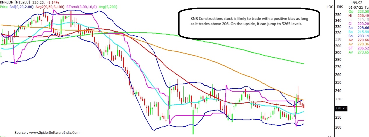 Current Price: ₹1,326 Upside Potential: 13.1% Support: ₹1,305; ₹1,264; ₹1,226 Resistance: ₹1,342; ₹1,390; ₹1,430 Voltas share is seen consolidating above its 100-DMA in recent days after a gap of nearly six months. The 100-DMA at ₹1,305 should act as a near-term support; below which the stock may seek support around ₹1,264 and ₹1,226 levels. On the upside, the stock can potentially surge to ₹1,500 levels, with interim resistance likely around ₹1,342, ₹1,390 and ₹1,430 levels. CLICK HERE FOR THE CHARTKNR Constructions
