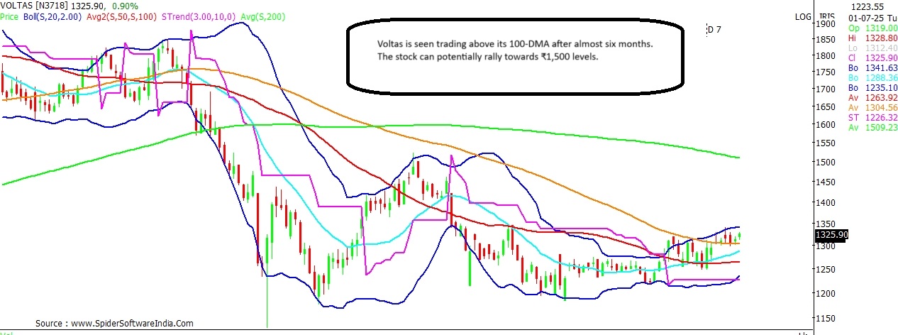 Current Price: ₹1,304 Upside Potential: 22.7% Support: ₹1,269; 1,119 Resistance: ₹1,400; ₹1,535 Raymond Lifestyle stock is seen attempting a breakout on the daily chart for the first-time since February 2025. The stock needs to register a weekly close above ₹1,279 to confirm the breakout. As such, the stock can potentially rally towards its 200-Day Moving Average (200-DMA), which stands around ₹1,600 levels, shows the daily chart. Interim resistance for the stock can be anticipated around ₹1,400 and ₹1,535 levels. Near support for the stock exists at ₹1,269; while the overall trend is likely to be favourable as long as the stock holds above 1,119 levels. CLICK HERE FOR THE CHART ALSO READ | Ola, Paytm crash up to 50% in H1 2025; are new-age stocks worth buying now?Voltas