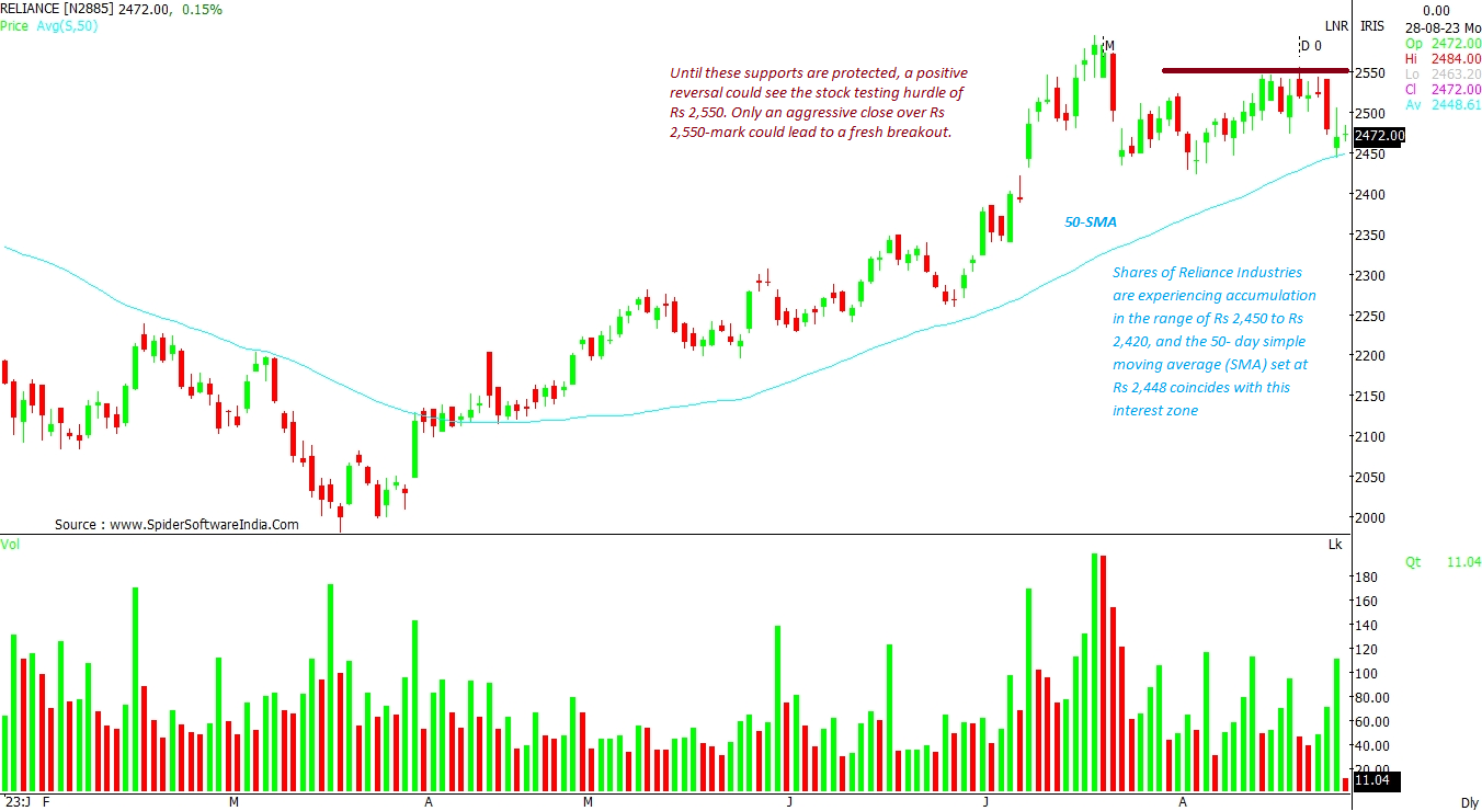 Shares of Reliance Industries are experiencing accumulation in the range of Rs 2,450 to Rs 2,420, and the 50- day simple moving average (SMA) set at Rs 2,448 coincides with this interest zone