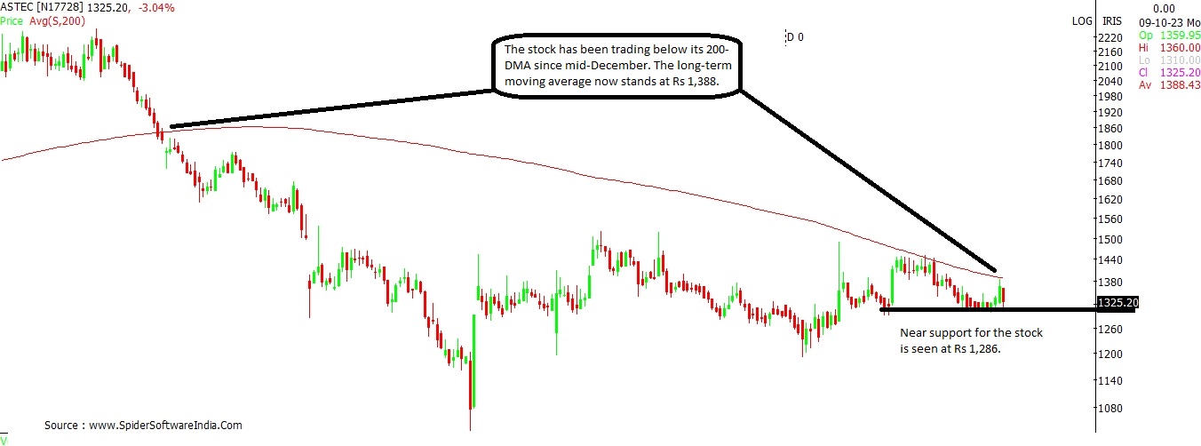 The stock has been trading with a bearish bias since mid-December 2022, after the stock broke its 200-DMA support. Since September, the stock is seen testing its 200-DMA hurdle, but has been unable to conquer it so far despite multiple attempts. The 200-DMA presently stands at Rs 1,388.