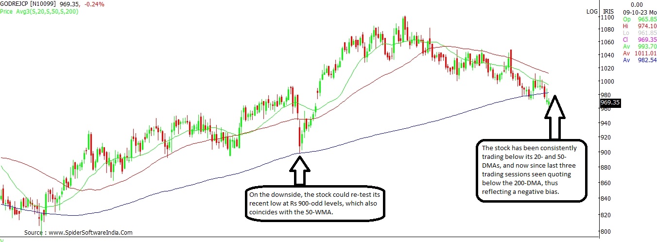 Shares of Godrej Consumer Products are seen trading with a negative bias since late July. Presently, the stock is trading below its 20-DMA and 50-DMA placed at Rs 996and Rs 1,012. In the last three trading sessions the stock is seen quoting below its 200-DMA which stands at Rs 983. Thus, the stock is likely to face downward pressure as long as it trades below the key moving averages.