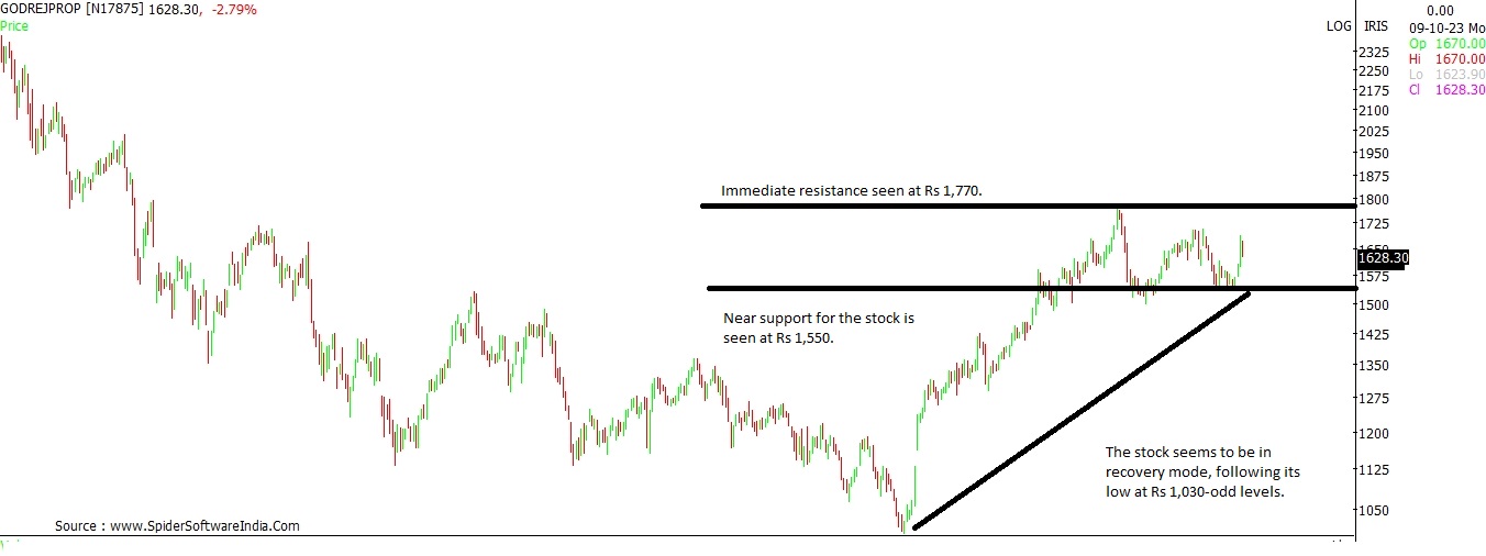 Godrej Properties seems to be in a pullback mode on the long-term charts. The stock needs to sustain its near support at Rs 1,550 level. In case, the support breaks, the stock could dip towards its previous low at Rs 1,330 odd levels. On the upside, the stock face immediate resistance at Rs 1,770. CLICK HERE FOR THE CHART