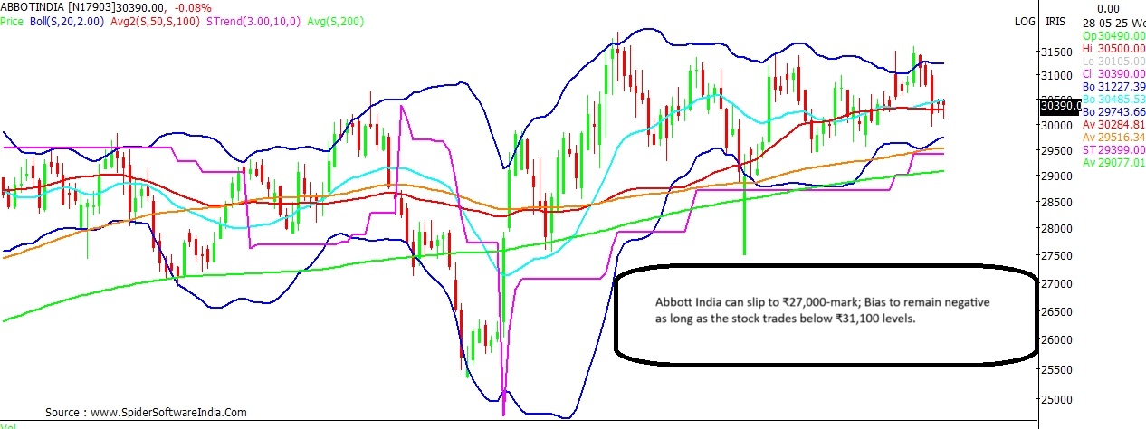 Current Price: ₹30,405 Downside Risk: 11.2% Support: ₹29,550; ₹29,100; ₹28,800 Resistance: ₹31,100 Abbott India stock is seen trading around its short-term moving averages - the 20-Day Moving Average (20-DMA) and the 50-DMA, which stand at ₹30,500 and ₹30,285 levels. On the downside, the stock can slip to ₹27,000-mark, with interim support likely around ₹29,550, ₹29,100 and ₹28,800 levels. The near-term bias is likely to remain tepid as long as the stock trades below ₹31,100 levels. CLICK HERE FOR THE CHART ALSO READ | LIC stock breaks above 200-DMA after 8 months; here's what may happen nextAurobindo Pharma