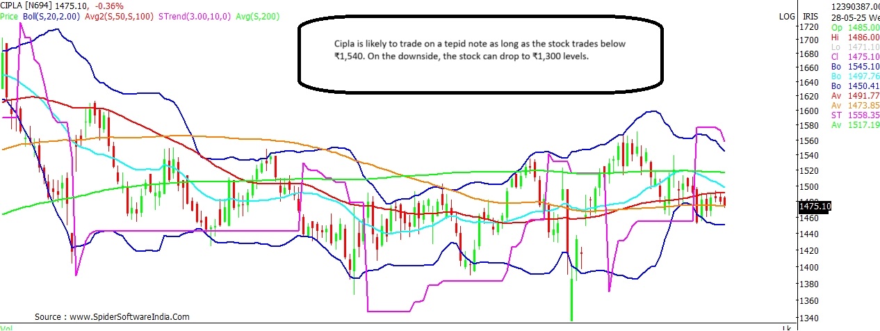 Cipla stock is seen trading around its 100-DMA, which stands at ₹1,492, for the last few trading sessions. Chart suggests that break and sustained trade below ₹1,450, can trigger a fall towards ₹1,300 levels. Interim support can be anticipated around ₹1,430 and ₹1,382 levels. Bias likely to remain tepid as long as the stock trades below ₹1,540.