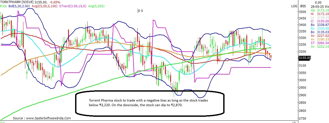 Current Price: ₹2,819 Downside Risk: 8.5% Support: ₹2,750; ₹2,700; ₹2,650 Resistance: ₹2,917; ₹3,020 Dr Lal PathLabs stock has been struggling around its 50-Week Moving Average (50-WMA) for the last six weeks. Tech charts suggest that the near-term bias for the stock is likely to remain negative as long as the stock trades below ₹2,917 and ₹3,020 levels. On the downside, the stock is seen testing support at the 20-DMA, which stands at ₹2,808; break and sustained trade below the same can trigger a slide towards ₹2,580 levels, with intermediate support anticipated around ₹2,750, ₹2,700 and ₹2,650 levels. CLICK HERE FOR THE CHARTTorrent Pharma