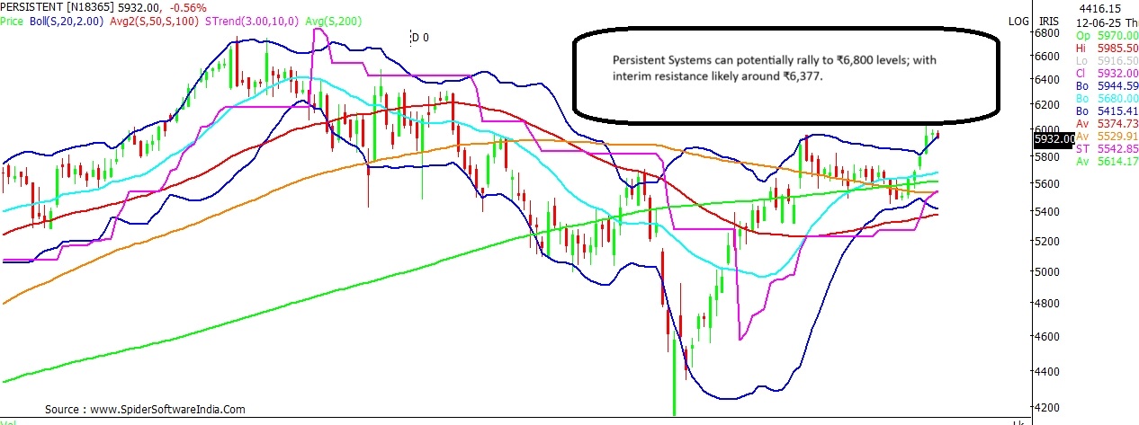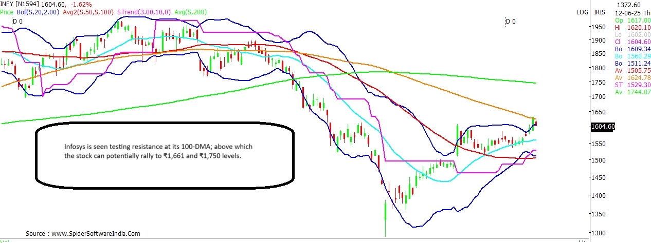 Current Price: ₹1,605 Upside Potential: 9% Support: ₹1,607; ₹1,579; ₹1,540 Resistance: ₹1,628; ₹1,661 Infosys stock was seen consolidating in a ₹100 band; between ₹1,520 - ₹1,610 for the last one month. The stock on Wednesday broke-out on the upside, and is now seen quoting near its 100-Day Moving Average, which stands at ₹1,628; above which another significant hurdle stands at ₹1,661. CLICK HERE FOR THE CHART Break and sustained trade above these hurdles can lead the stock towards ₹1,750 levels, shows the daily chart. Support for the stock can be anticipated around ₹1,607, ₹1,579 and ₹1,540 levels.Persistent Systems